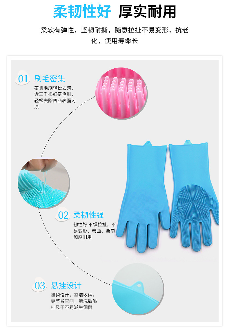 3.手套易清洗徹底不滋生細(xì)菌,這一點(diǎn)是很多清潔用品都做不到的,油脂、醬油、醋、污垢等等都無法有力附著在硅膠表面,而其他比如鋼絲球、海綿塊、洗碗布等等材質(zhì),都做不到,使用硅膠洗碗手套實(shí)在是讓人放心。